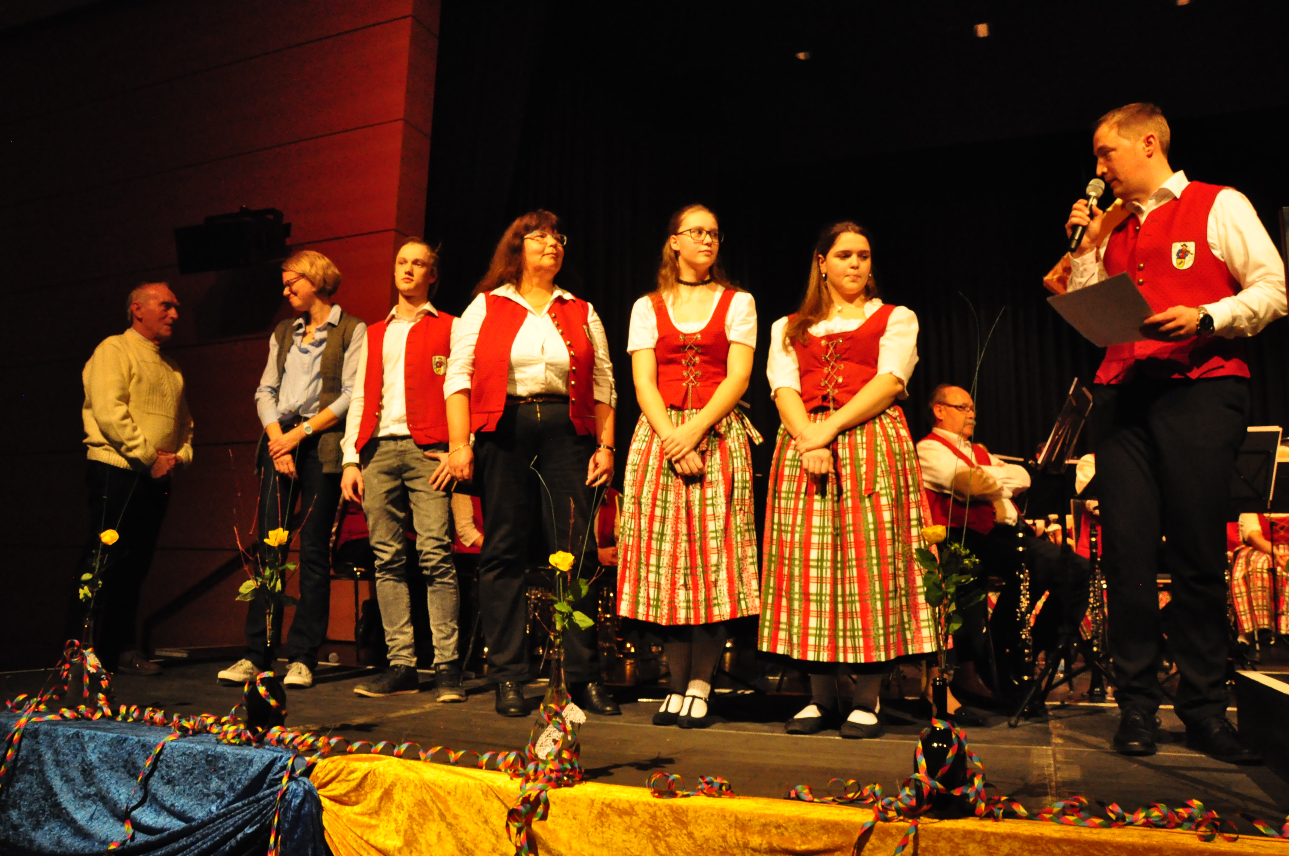 Wie jedes Jahr wird der Rahmen des Konzertes genutzt um verdiente Mitglieder zu ehren. Für 10 Jahre aktiv wurden Jana Kellner und Jakob Harsch mit der bronzenen Nadel geehrt. Karin Haug erhielt für 20 Jahre aktiv die silberne Nadel und Christine Mitrega für 30 Jahre (teils aktiv) die goldene Nadel. Für 50 Jahre aktive und fördernde Mitgliedschaft erhielt Günter Klingenstein die goldene Nadel mit Diamant und eine Urkunde des Blasmusikverbandes. Weiterhin erhielten Felix Jirka die silberne Nadel für 20 Jahre, Michael Brugger die goldene Nadel für 30 Jahre teils aktive und fördernde Mitgliedschaft. Willi Möhlmann bekam die goldene Nadel für 30 Jahre fördernde Mitgliedschaft. Für 40 Jahre teils aktive Zeit wurde Thomas Huber geehrt. Ebenfalls wurde im Rahmen des Aulakonzertes Jana Kellner und Isabel Gans die Nadel für den bestanden D2 Lehrgang überreicht.