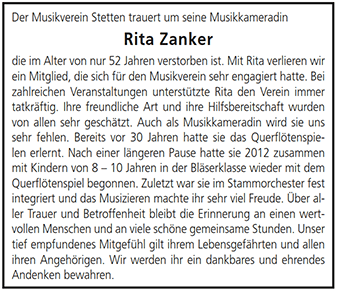 In der Nacht auf den 1. August 2017 verstarb unser Mitglied, unsere Musikkameradin und Freundin Rita Zanker nach schwerer Krankheit. Die Trauerfeier, die von unserem Orchester musikalisch umrahmt wurde, fand am 4. August 2017 in Strümpfelbach statt.
