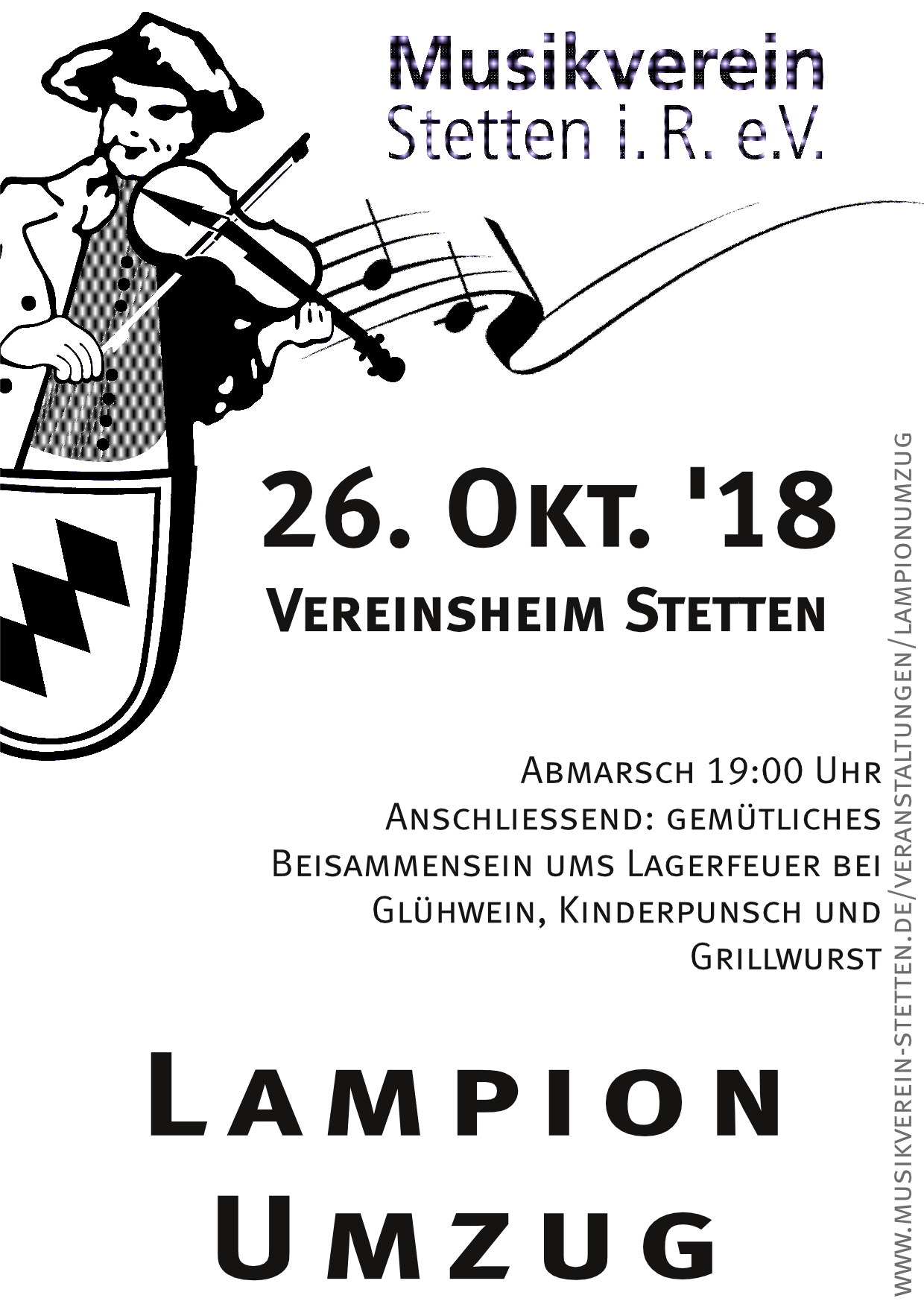 Der Lampionumzug findet in diesem Jahr am 26. Oktober, 19 Uhr am Vereinsheim statt. Der Lampionumzug führt über die Frauenländerstraße, Brühlstraße, Albert-Moser-Straße und zurück zur Frauenländerstraße und wird durch das Jugendorchester des MV Stetten begleitet. Im Anschluss gibt es beim Lagerfeuer wieder Glühwein, Kinderpunsch und Gegrilltes. HIerzu laden wir alle Kinder mit Ihren Eltern recht herzlich.