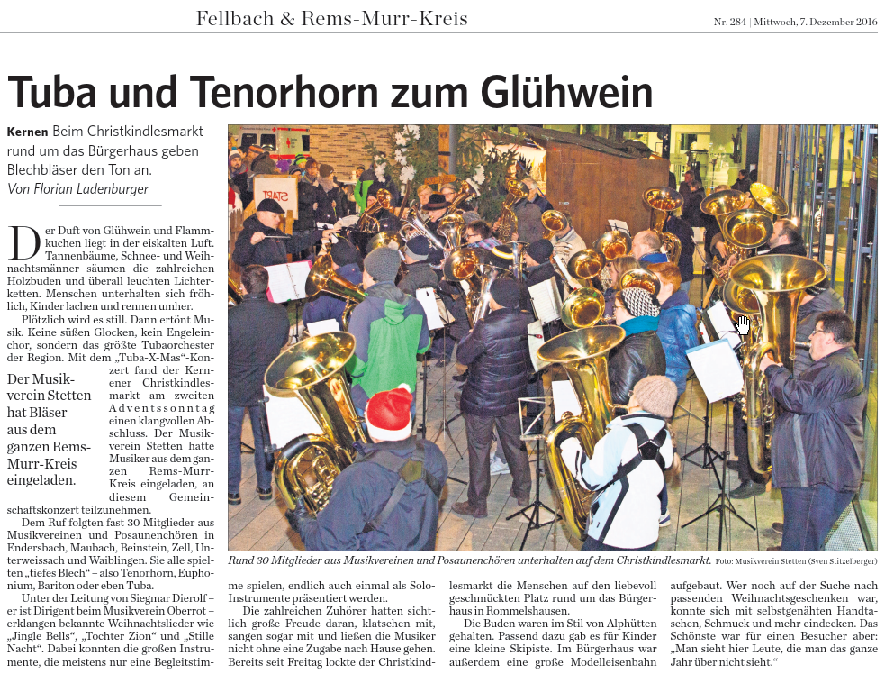 Ein großes Ereignis und ein Instrument werfen ihre Schatten voraus: Am 4. Dezember 2016 findet um 17 Uhr auf dem Christkindlesmarkt in Rommelshausen die erste Kernener Tuba X-Mas statt. Mitten in der hektischen Adventszeit möchten wir den Menschen einen Ruhepol geben. Und wie könnte das besser gehen, als mit dem größten Tubaorchester der Region. Dazu wurden aus Musikvereinen und Posaunenchören im Rems-Murr-Kreis interessierte Musikerinnen und Musiker gefunden, die Tuba, Euphonium, Bariton oder Tenorhorn spielen.